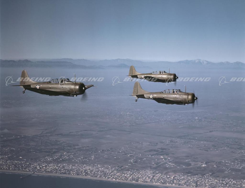Douglas SBD Dauntless (1940-1944): One of the great carrier planes of all time, this rugged Douglas dive- bomber was one of the few American naval aircraft not inferior in performance to its enemy counterparts at the outbreak of World War II. Designed by a team headed by the famous Ed Heinemann, the SBD made its first flight on May 1,1940. The Dauntless was the only U.S. combat aircraft to see action in every major naval engagement of the war in the Pacific. It sunk more enemy ships than any other aircraft, and had the lowest loss ratio of any carrier-based plane. The Dauntless’ greatest day was June 4, 1942, when, during the battle of Midway, SBDs from the aircraft carriers Enterprise and Yorktown sank four Japanese carriers. Though not designed as fighters, SBDs were credited with downing 138 enemy planes in air-to-air combat. Built at the Douglas El Segundo plant at Mines Field (now Los Angeles International Airport), production peaked at 11 aircraft a day. A total of 5,936 SBDs were delivered to the Navy, Marines Corps, and Army Air Forces (as the A-24).