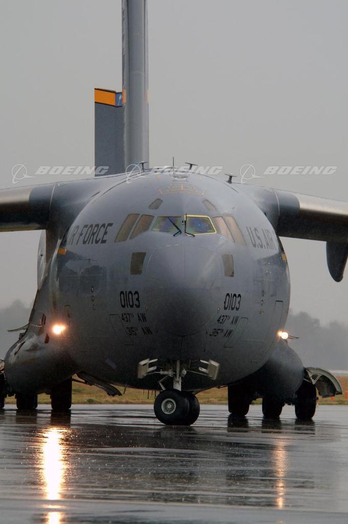 The C-17 Globemaster III is a high-wing, four-engine, T-tailed aircraft with a rear loading ramp. With its 160,000-pound payload, the C-17 can take off from a 7,600-foot airfield, fly 2,400 nautical miles and land on a small, austere airfield in 3,000 feet or less. On the ground, a fully loaded aircraft, using engine reversers, can back up a 2 percent slope. During normal testing, C-17s set 22 world records, including payload to altitude time-to-climb and the short takeoff and landing mark, in which the C-17 took off in less than 1,400 feet, carried a payload of 44,000 pounds to altitude and landed in less than 1,400 feet. Deployed in June 1993, it won the Collier Trophy in 1994, symbolizing the top aeronautical achievement of 1994.