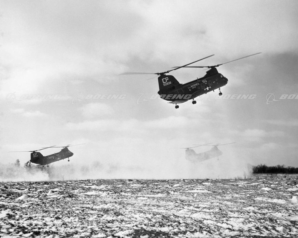 United States Marine Corp's winter training exercise "Snowfex 65" at Camp Drum near Watertown, New York in 1965. "Snowfex" was a month long exercise in which Marine Corps units and equipment received extensive arctic training under severe winter conditions. Nineteen CH-46A Sea Knights from Squadron HMM-265 Marine Corps Air Facility at New River, North Carolina, were used to transport troops, cargo and vehicles during the operation. Shown above are three Sea Knights helicopters preparing to land and deliver troops during a mock battle exercise which concluded the month long operation. The Sea Knights flew missions in temperatures thirty degrees below zero and during snow storms.
