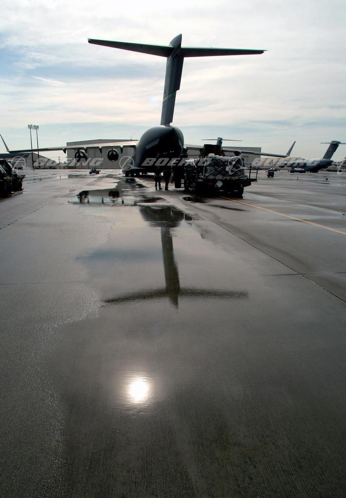 The C-17 Globemaster III is a high-wing, four-engine, T-tailed aircraft with a rear loading ramp. With its 160,000-pound payload, the C-17 can take off from a 7,600-foot airfield, fly 2,400 nautical miles and land on a small, austere airfield in 3,000 feet or less. On the ground, a fully loaded aircraft, using engine reversers, can back up a 2 percent slope. During normal testing, C-17s set 22 world records, including payload to altitude time-to-climb and the short takeoff and landing mark, in which the C-17 took off in less than 1,400 feet, carried a payload of 44,000 pounds to altitude and landed in less than 1,400 feet. Deployed in June 1993, it won the Collier Trophy in 1994, symbolizing the top aeronautical achievement of 1994.