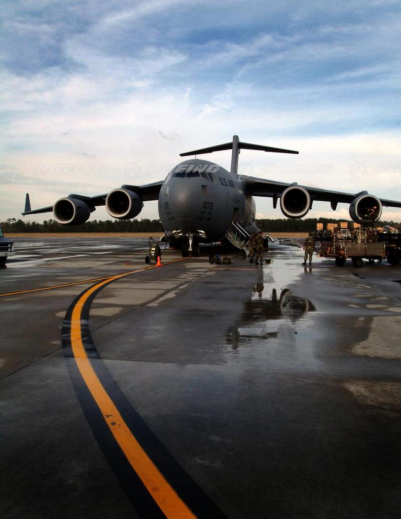 The C-17 Globemaster III is a high-wing, four-engine, T-tailed aircraft with a rear loading ramp. With its 160,000-pound payload, the C-17 can take off from a 7,600-foot airfield, fly 2,400 nautical miles and land on a small, austere airfield in 3,000 feet or less. On the ground, a fully loaded aircraft, using engine reversers, can back up a 2 percent slope. During normal testing, C-17s set 22 world records, including payload to altitude time-to-climb and the short takeoff and landing mark, in which the C-17 took off in less than 1,400 feet, carried a payload of 44,000 pounds to altitude and landed in less than 1,400 feet. Deployed in June 1993, it won the Collier Trophy in 1994, symbolizing the top aeronautical achievement of 1994.
