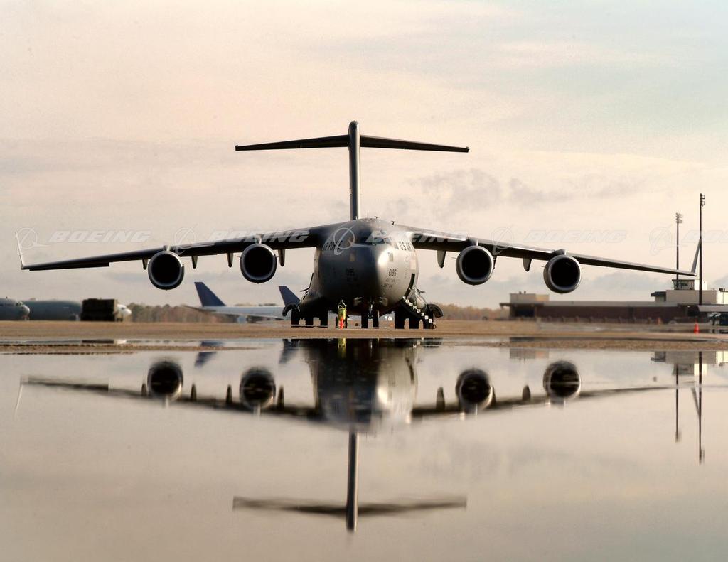 C-17 Globemaster III Mirror Image Reflected in Wet Tarmac