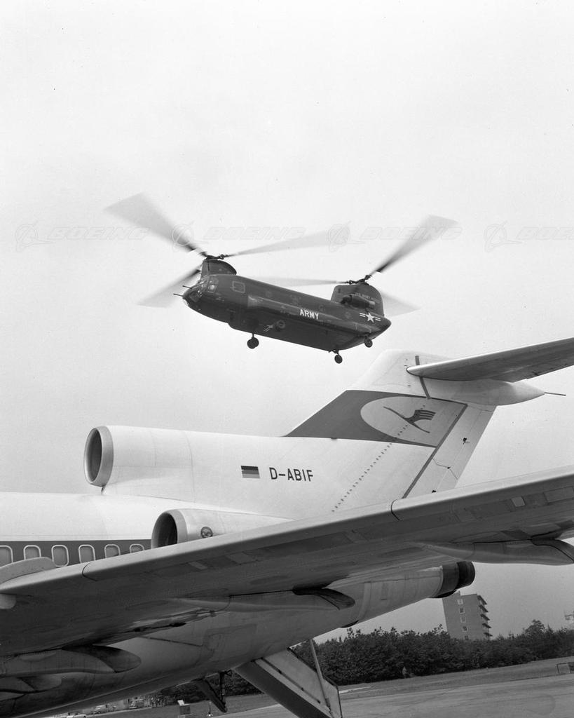 CH-47A Chinook Helicopter in Flight over Tail of 727