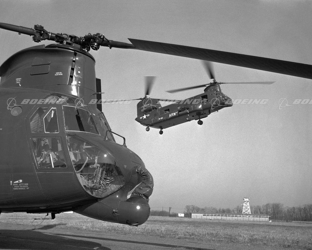 CH-47A Chinook Helicopter in Flight over Tail of 727