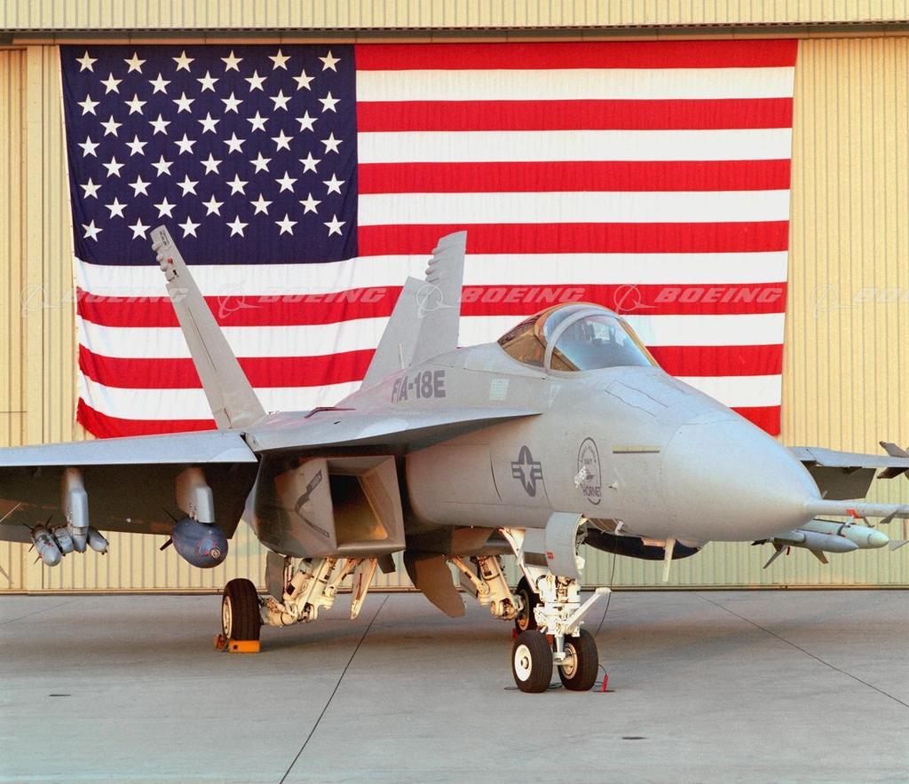 The U.S. Navy's multi-mission, all-weather, potent strike-fighter, the F/A-18E/F Super Hornet, stands guard in front of the Stars and Stripes at sunrise at the F/A-18E/F Integrated Test Team facility at Naval Air Station Patuxent River, MD. The Super Hornets passed the 1,500 flight-hour mark Aug. 29 1997.