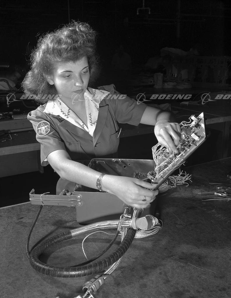 At first, women worked only in the small handwork departments at NAA's Kansas division. Then gradually they were assigned to the pattern shop, the final assembly line, welding, punch-pressing, and other production departments. By the end of WWII, more than 40 percent of NAA's Kansas division were women, working in almost every department.