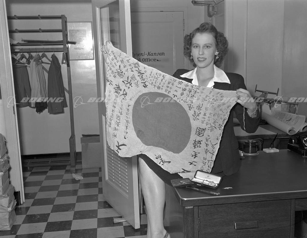 NAA Employee with Japanese Marine Flag at the offices of The North Ameri-Kansan, the Kansas City Facility's in-house publication.