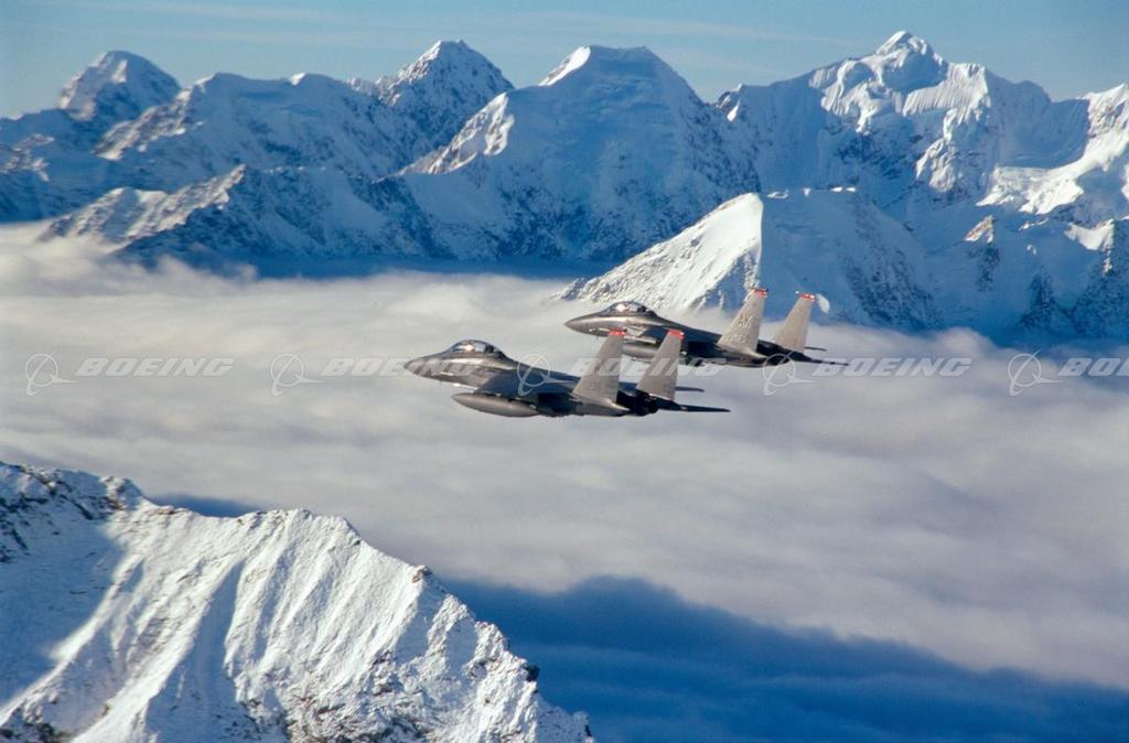 Twin F-15E Strike Eagles in Flight over Alaskan Wilderness