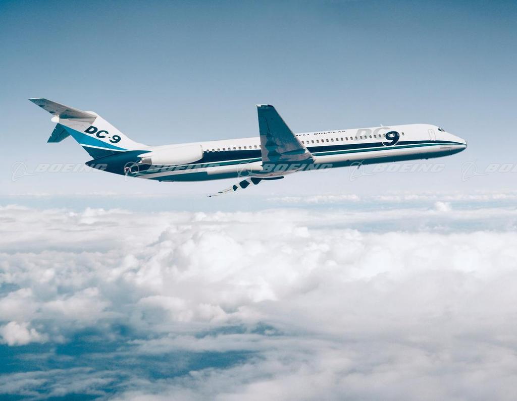 Smaller than the DC-8, the trim DC-9 has a distinctive high-level horizontal stabilizer atop the rudder, commonly called a T tail.