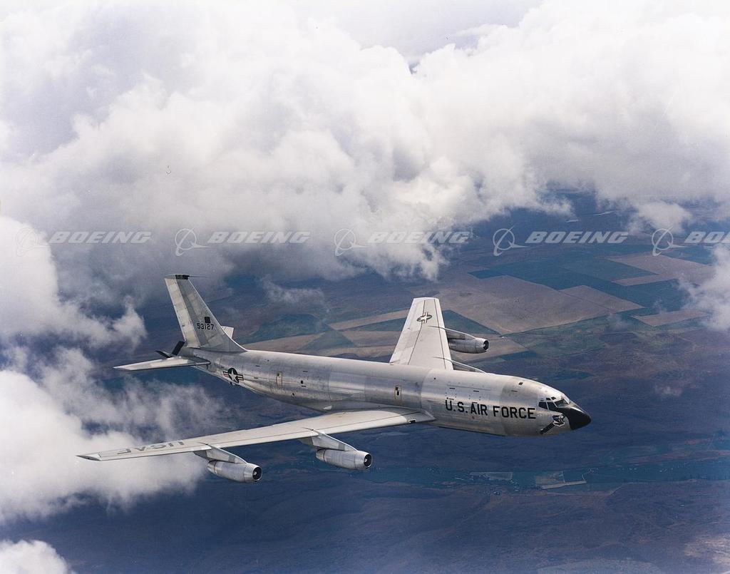 The KC-135 Tanker aircraft is equipped with a flying boom for fuel transfer to selected military aircraft in-flight.