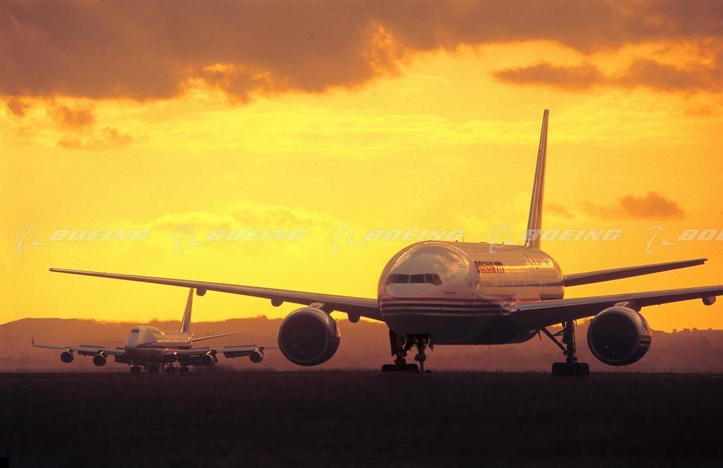 777 on Ground at Sunset, 747 in Background