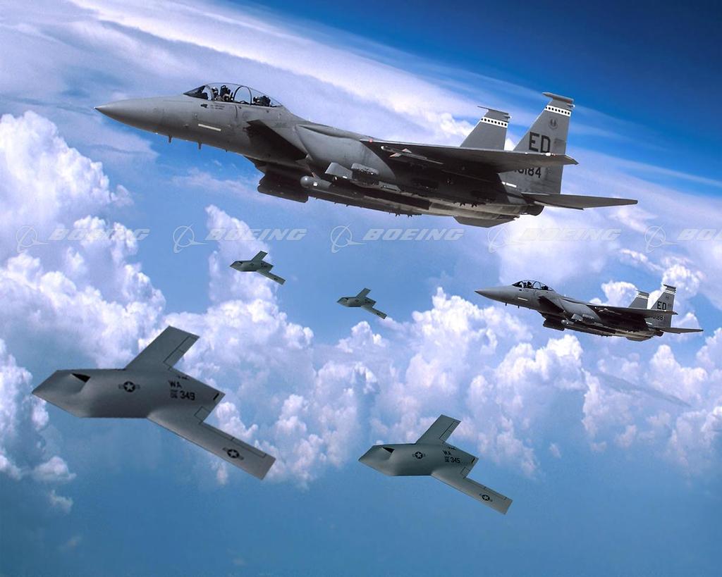 X-45A UCAVs in Flight with F-15 Eagle Jet Fighters