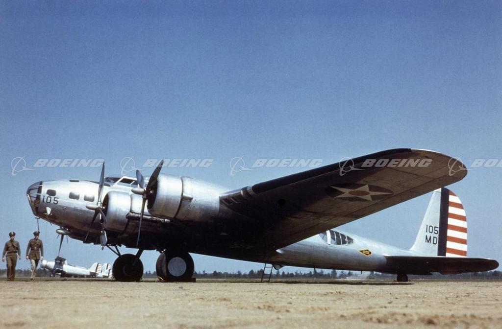 The B-17 was a low-wing monoplane that combined aerodynamic features of the XB-15 giant bomber, still in the design stage, and the Model 247 transport. The B-17 was the first Boeing military aircraft with a flight deck instead of an open cockpit and was armed with bombs and five .30-caliber machine guns mounted in clear "blisters." The B-17E, the first mass-produced model Flying Fortress, carried nine machine guns and a 4,000-pound bomb load. It was several tons heavier than the prototypes and bristled with armament. It was the first Boeing airplane with the distinctive -- and enormous -- tail for improved control and stability during high-altitude bombing. Each version was more heavily armed.