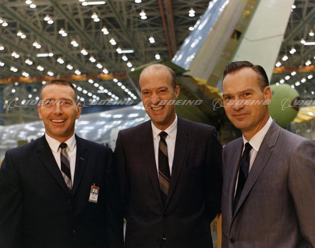 At the rollout ceremonies in 1968, the members of the "first flight" crew took a moment to pose near the airplane they had been assigned to fly. Jess Wallick, the flight engineer at left, and Jack Waddell, the pilot, center, with the 747 program since it began in 1966, had helped with the airplane's design, particularly the cockpit. Co-pilot Brien Wygle, at right, joined the program shortly before the rollout, having been chief test pilot of the 737 program. All three men are qualified pilots, as well as engineers. The first flight took place successfully on February 9, 1969.