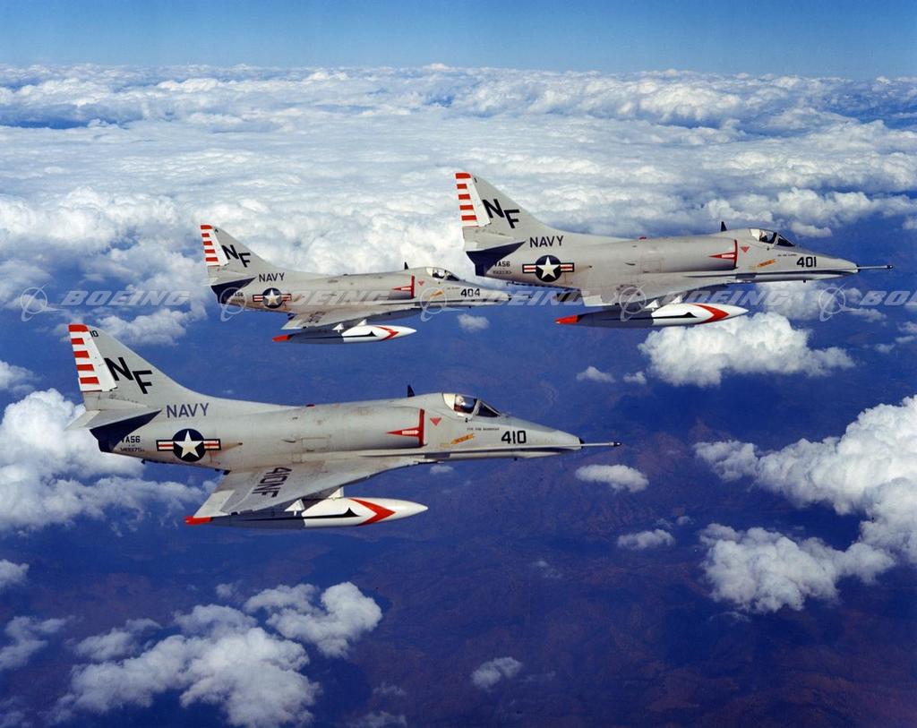 Douglas built 2,960 Skyhawks between 1954 and 1979. Built small to be cost effective and so that more could be accommodated on a carrier, the lightweight, high-speed bombers were affectionately nicknamed "Heinemann's Hot Rod" (after Douglas designer Ed Heinemann), the Bantam Bomber, Mighty Mite and Scooter. Skyhawks provided the U.S. Navy and Marines and friendly nations with maneuverable, yet powerful, attack bombers that had great altitude and range capabilities, plus an unusual flexibility in armament capacity.
