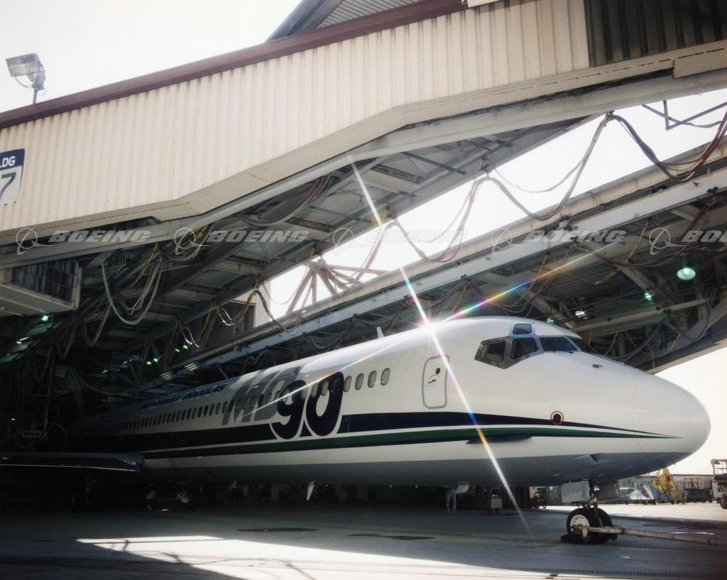 The McDonnell Douglas MD-90 glistened in the first rays of sunlight as the freshly painted aircraft emerged from the paint hangar in Long Beach, CA. The paint scheme of midnight blue, forest green and sky blue on white was designed to represent the commitment of McDonnell Douglas to provide an aircraft that was ready to meet and exceed low noise and emission levels around the world in the 1990s.