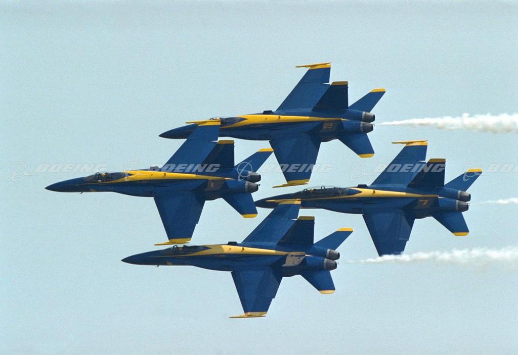 Blue Angels F/A-18A Hornets Perform a Delta Pass Over Boeing in St. Louis