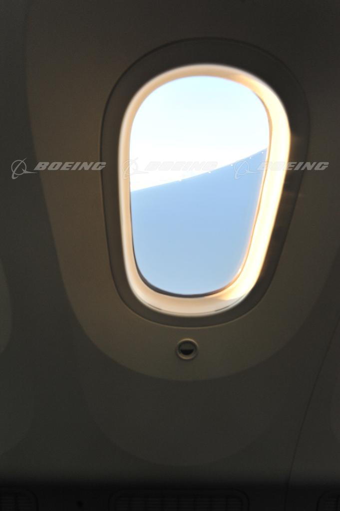 The 787 Dreamliner cabin windows feature electro-chromic shades and are the largest on any of today’s commercial airplanes, 70 percent larger than those on current aircraft of its size.