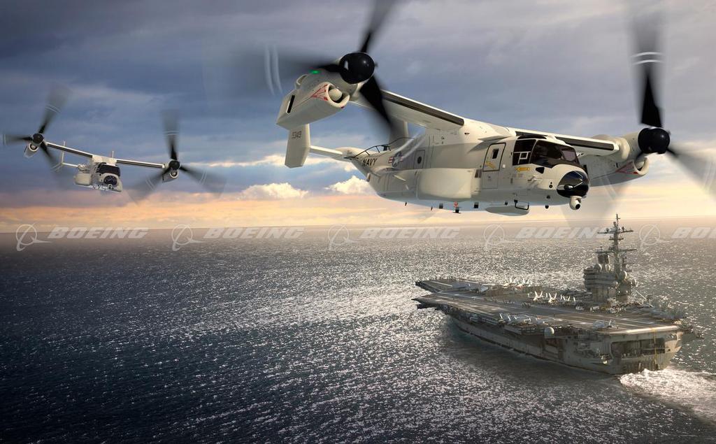 The CMV-22B, depicted here, is the latest V-22 variant that Boeing began assembling in May 2018 following three years of development. The CMV-22B will enable the Navy to efficiently transport cargo from shore to aircraft carriers.