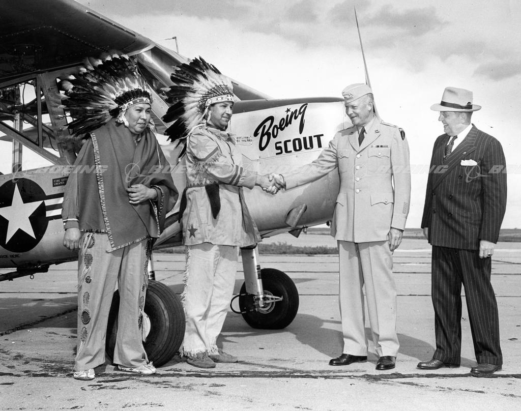 During a visit to Boeing Airplane Company's Wichita Division on April 25, 1948, General Dwight D. Eisenhower offered his congratulations on the selection of the name "Scout" for the Boeing XL-15 liaison plane. Tweleve of the versatile single-engine all-metal planes were produced at the Wichita Division for the U. S. Army Field Forces. Attired in full Indian dress for the occasion were Francis Stumblingbear, left, of the Kiowa tribe, and Gordon Bushyhead, of the Cherokees, both veteran Boeing employees. At the right is J. E. Schaefer, Boeing vice president and general manger of the Wichita Division.