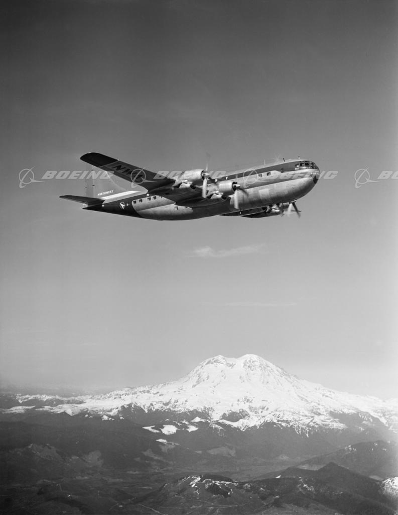 377 Stratocruiser in Flight Over Clouds and Mt. Rainier