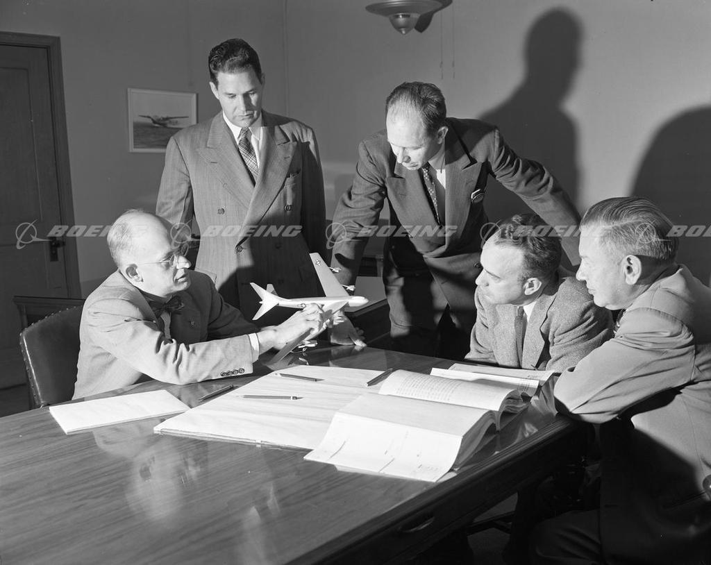 The design team that developed the B-52 Stratofortress reenacting what has become known as the "Dayton Weekend." In October 1948, the Boeing team presented a turboprop design for the B-52 to U.S. Air Force Colonel Pete Warden, who suggested the team redesign the airplane into a swept-wing all-jet design like the B-47 Stratojet. It was a Friday, and he gave the team until Monday to come up with a new design. Over the weekend, the team of (left to right) George Schairer, Vaughn Blumenthal, Maynard Pennell, Ed Wells, Art Carlsen, and Bob Withington (not pictured in this photo) worked on the new design. Schairer made a balsa wood model, and Ed Wells led the development of a 33 page proposal. After seeing the model and the proposal, Colonel Warden said, "Now we have an airplane. This is the B-52." After more than half a century, the model is preserved in the Boeing Archives and the U.S. Air Force is still flying the B-52.
