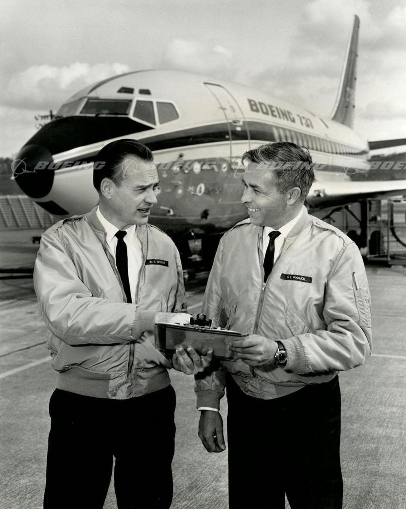 Chief test pilot Brien Wygle (left) and his copilot Lew Wallick standing in front of a Boeing 737 prior to making the first flight April 9, 1967.
