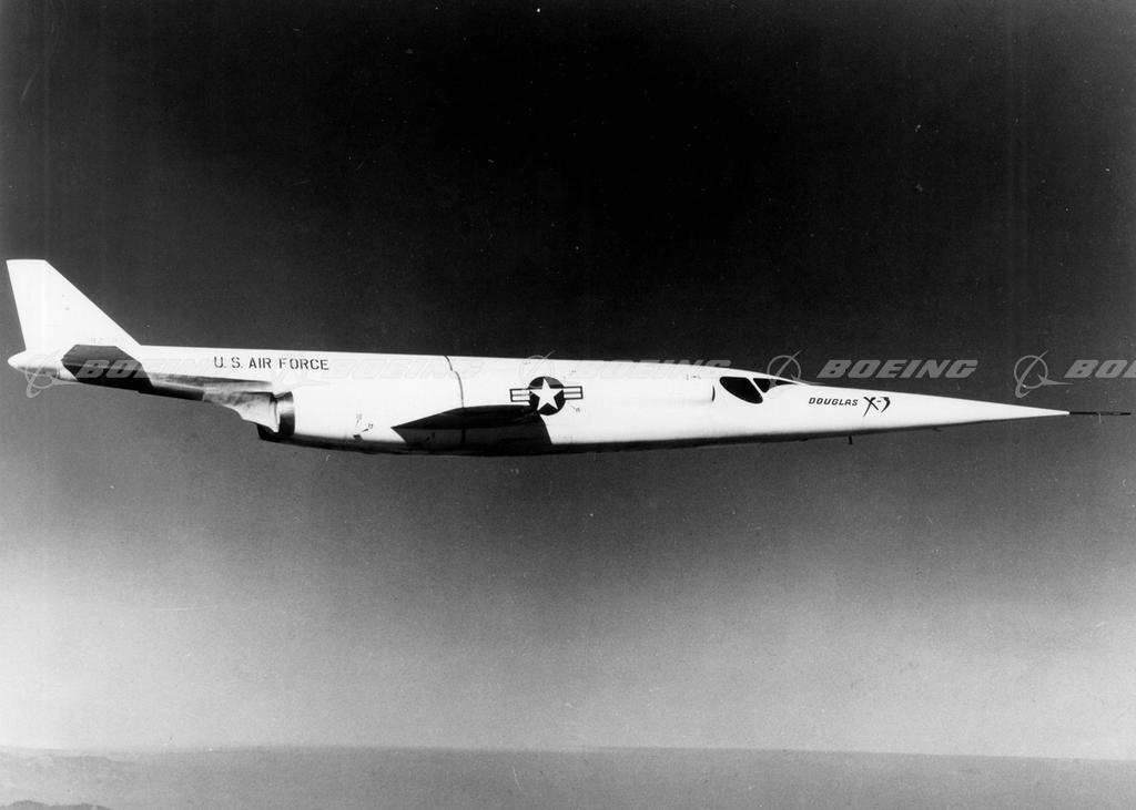 The single experimental Douglas X-3, called the Stiletto because of its knife-like shape, was built to test the effects of high temperatures induced by high speeds on an aircraft, to investigate the use of new materials such as titanium, and to explore new construction techniques. Major Charles E. Yeager, who was the first pilot to exceed the speed of sound, was part of the inspection team for the Stiletto mockup. The unusual aircraft had a long, tapered nose, which contained most of its 1,200 pounds of instrumentation, and tiny wings. Although the aircraft never reached the speeds it was designed for, it contributed greatly to the development of high-speed aircraft. Data obtained with the X-3 was distributed throughout the U.S. aviation industry. In 1956, the X-3 found its resting place at the U.S. Air Force Museum.