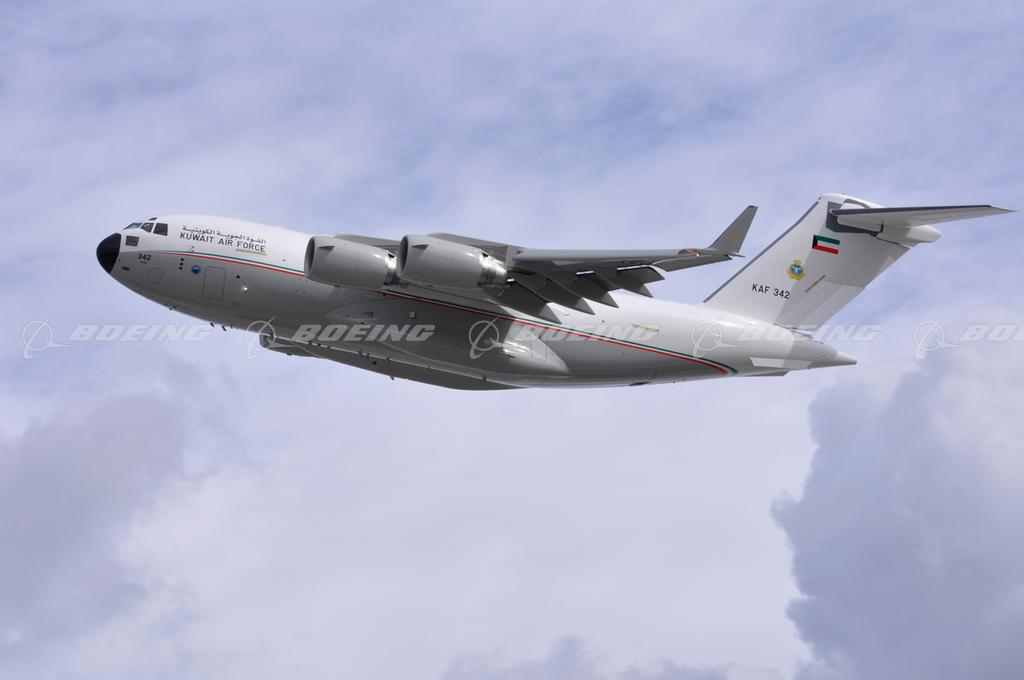 Kuwait’s first C-17 Globemaster III airlifter, an aircraft that will expand the Kuwait Air Force’s capabilities in military and civilian operations, including humanitarian aid and disaster relief, on its January 31, 2014 first flight. A custom paint design distinguishes the Kuwait C-17 from the 259 others that have been delivered to customers around the world. Boeing has delivered C-17s to the U.S. Air Force, Kuwait, Australia, Canada, India, Qatar, the United Arab Emirates, the United Kingdom and the 12-member Strategic Airlift Capability initiative of NATO and Partnership for Peace nations.