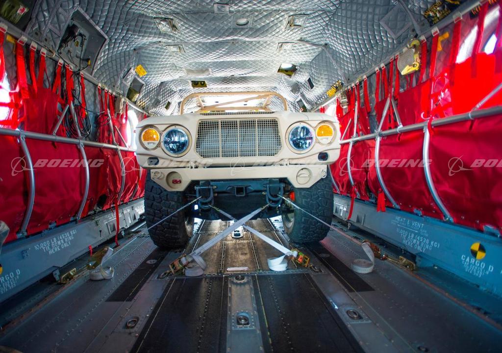 A Boeing Phantom Badger is tied down inside a CH-47 Chinook in April 2014. Phantom Badger is a rugged combat support vehicle that features a modular design to provided added mission flexibility for the warfighter. It was certified for internal transport aboard the V-22 and CH-47 in 2014. Two Phantom Badgers can fit inside a CH-47.
