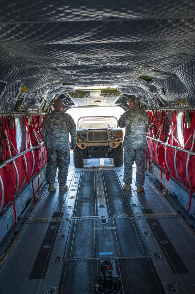 Two Army loadmasters guide a Boeing Phantom Badger as it drives aboard a CH-47 Chinook in April 2014. Phantom Badger is a rugged combat support vehicle that features a modular design to provided added mission flexibility for the warfighter. It was certified for internal transport aboard the V-22 and CH-47 in 2014. Two Phantom Badgers can fit inside a CH-47.
