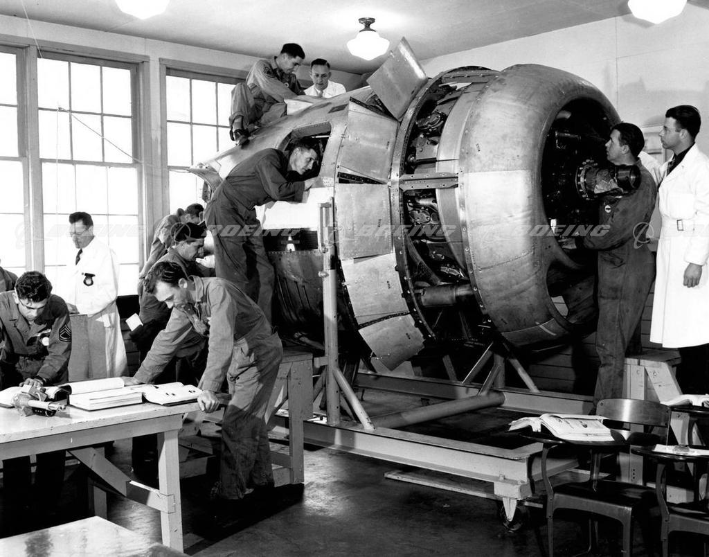 US Air Force mechanics study a B-29's R-3350 engine at the Boeing Superfortress School during World War II. In 1942 Boeing committed half a million dollars to construct and equip a B-17 Flying Fortress training school on the north end of Boeing Field. It included barracks, three hangars, classrooms, a dispensary and a theater. B-29 training began in February 1943. The school ran day and night until the war ended and closed in October 1945. By then Boeing had trained 30,000 mechanics and flight engineers as well as pilots and navigators on how to maintain Boeing B-17 and B-29 bombers.