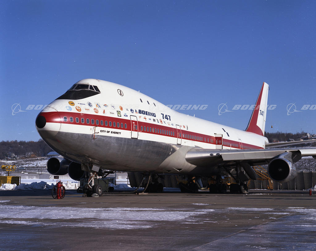 The first Boeing 747 (RA001) awaits its next test flight. It was never sold. Circa 1970.