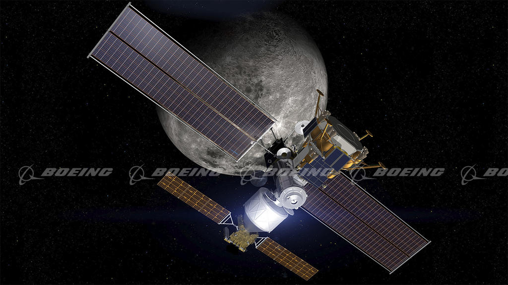 Artist's conception - Boeing Human Lander System docked with Gateway. The integrated lander’s flexible, reliable design will safely take astronauts down to the Moon’s surface. The Lander and Gateway combination is essential to sustained lunar exploration and to go to Mars.