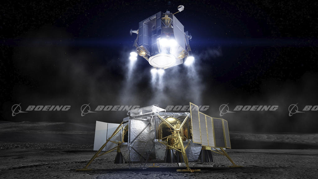 Following exploration of the lunar surface by astronauts, the crew lifts off from the moon inside the Ascent Element in this artist concept. The Descent Element remains on the moon having already performed its role of flying the crew from lunar orbit to the surface. (Boeing photo)