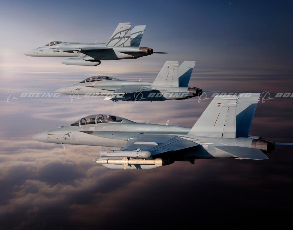 An artist's depiction of the Boeing Advanced Super Hornet, F/A-18F Super Hornet, and EA-18G Growler in formation flight. Reserved for use by Suppliers in 2014.