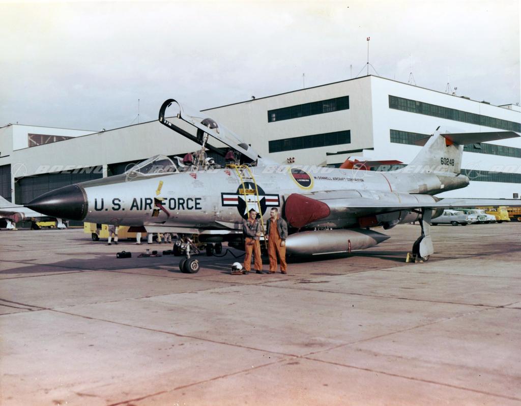 F-101B Voodoo "Project Eclipse" with Irv Burrows and Jack Hereford on McDonnell Aircraft flight ramp in St. Louis, MO. The B model featured a cockpit modified for a crew of two, a larger forward fuselage for an improved radar, larger engines, and carried air-to-air missiles instead of cannons. Top speed was Mach 1.85. 479 F-101Bs were deleivered to air forces in the US and Canada.