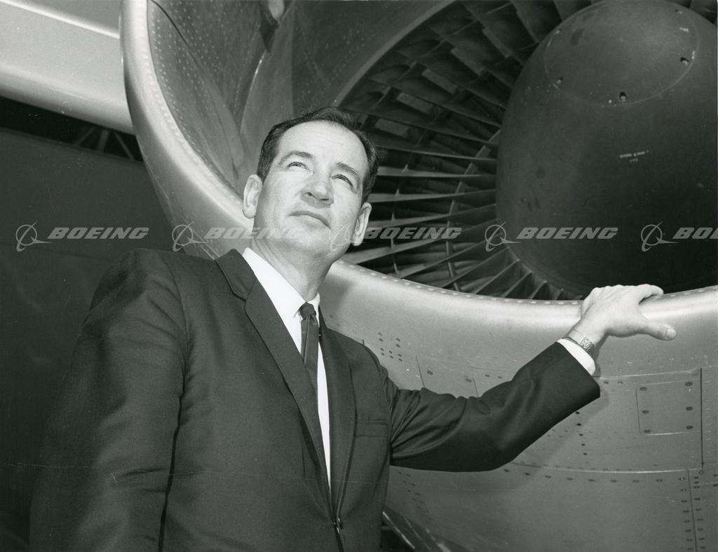 Joe Sutter standing in front of 747 engine with left hand on cowling.