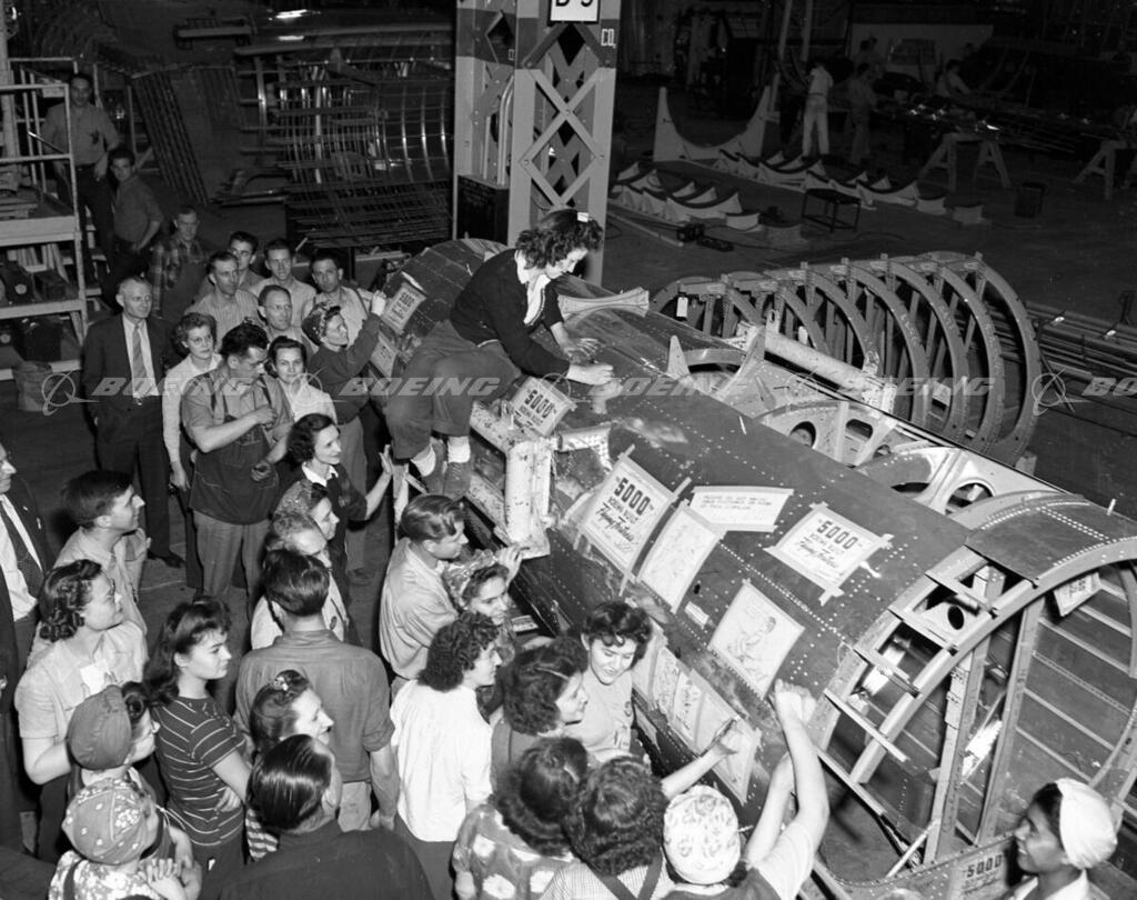 Employees sign a fuselage to commemerate 5,000 Boeing Built Flying Fortresses.