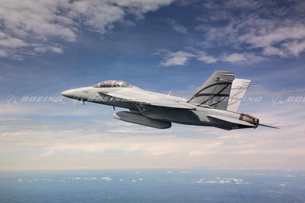 First flight of the F/A-18E/F Advanced Super Hornet with conformal fuel tanks and Enclosed Weapons Pod, August 2013.